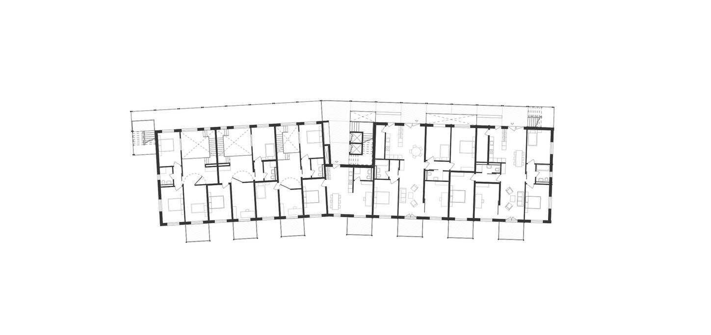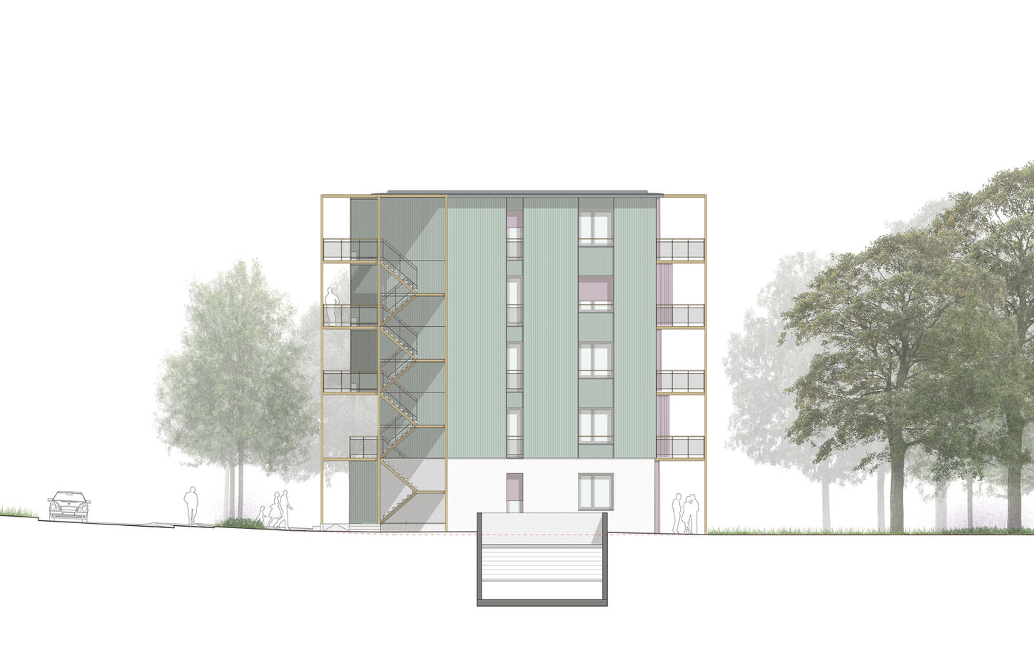 Das längliche riegelförmige Gebäude klärt weiterhin den Bezug zwischen öffentlichen, quartiersbezogenen, gemeinschaftlichen und privaten Flächen und formuliert deren Schwellenräume subtil und präzise aus. Im Norden zur Rückringenstrasse orientiert liegen die öffentlichsten Orte mit der Adressierung, dem nachbarschaftlichen Laubengang und einem gemeinschaftlichen Platzbereich. Gegen Süden hin orientieren sich die privateren und den Mietenden zugeordneten Bereichen mit der Balkonschicht und dem gemeinschaftlichen Garten. Die Fläche der Parzelle 925 wird durch präzise Eingriffe und Pflege des heutigen Baumbestandes als kleiner Quartierpark ausformuliert und bietet einen Treff- und Aufenthaltspunkt für die gesamte Quartiersgemeinschaft.